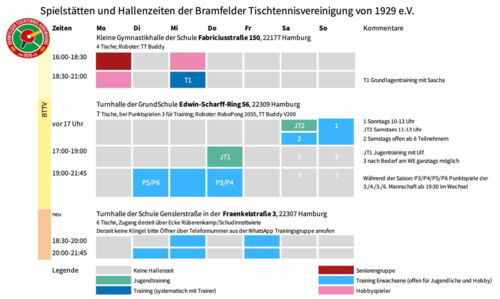 Für das Schnuppern empfehlen wir Zeiten mit freiem Training und Zeiten für Hobbyspieler. Schaut Euch gern beide Spiellokale zu unterschiedlichen Zeiten an, um den besten Überblick zu bekommen.